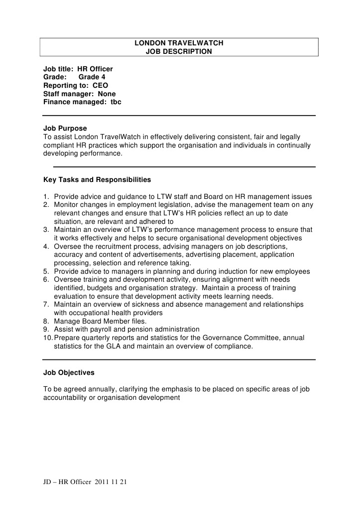 Hr Officer Job Description Employment Accountability from imgv2-1-f.scribdassets.com Job description title of post: Provide office administrative support to the human resources office, and serve as a resource to aisj employees. Managing payroll and pensions and calculating staff entitlements and benefits 8. Previous senior hr officer / advisor role experience 2. Duties • develop hr strategy that supports the overall business goals of the company. 10.01.14 page 2 of 5 assist the ict manager in the development and implementation of the 3 years ict technology refresh to the infrastructure programme. Managing computerised hr database and other office. Experience of delivering training 3.