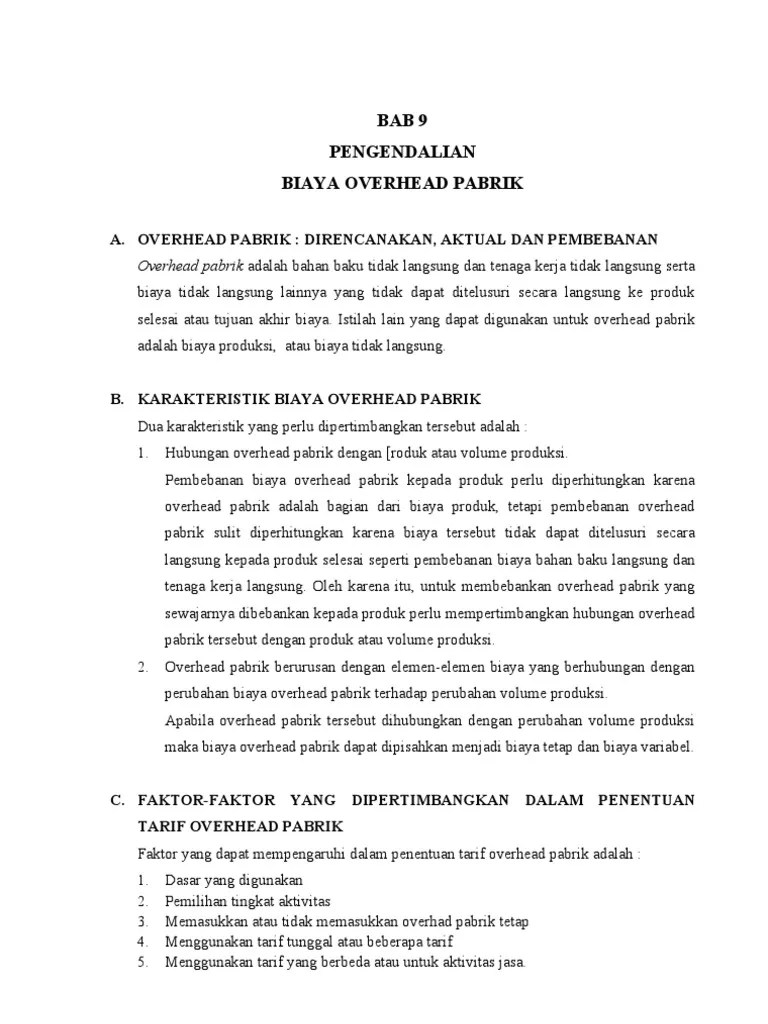 Contoh biaya overhead aktual b: Dikarenakan biaya ini sangat penting bagi bisnis anda, ada baiknya anda mengerti terlebih dahulu sistem akuntansi biaya. Pada poin pertama ini sifat biaya overhead adalah tetap dan umumnya dikeluarkan. Biaya overhead dibedakan menjadi 3 jenis, yaitu biaya overhead tetap, variabel, dan semi variabel. Biaya normal menghasilkan lebih sedikit fluktuasi dalam alokasi overhead, karena didasarkan pada perkiraan jangka panjang untuk biaya overhead.